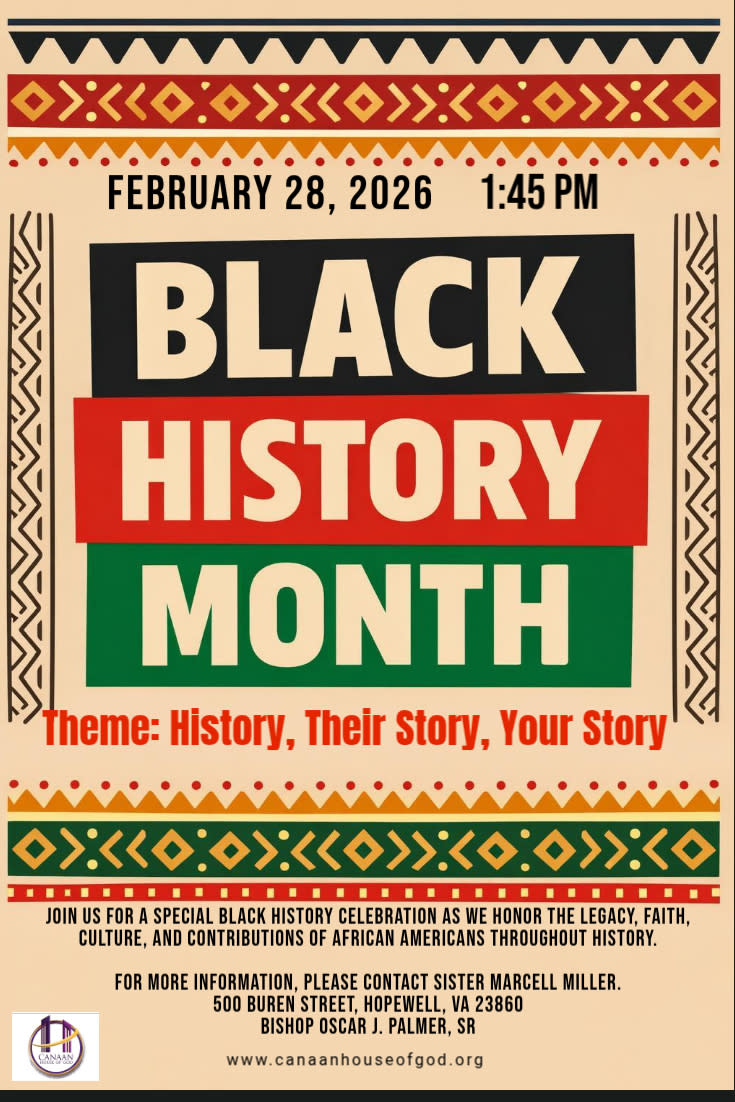 Canaan House of God is celebrating Black History Month on February 28th at 1:45 PM, and you’re invited to an empowering experience. Join us as we move in purpose under the theme “History, Their Story, Your Story”—a powerful celebration of black history, legacy, faith, culture and contributions.