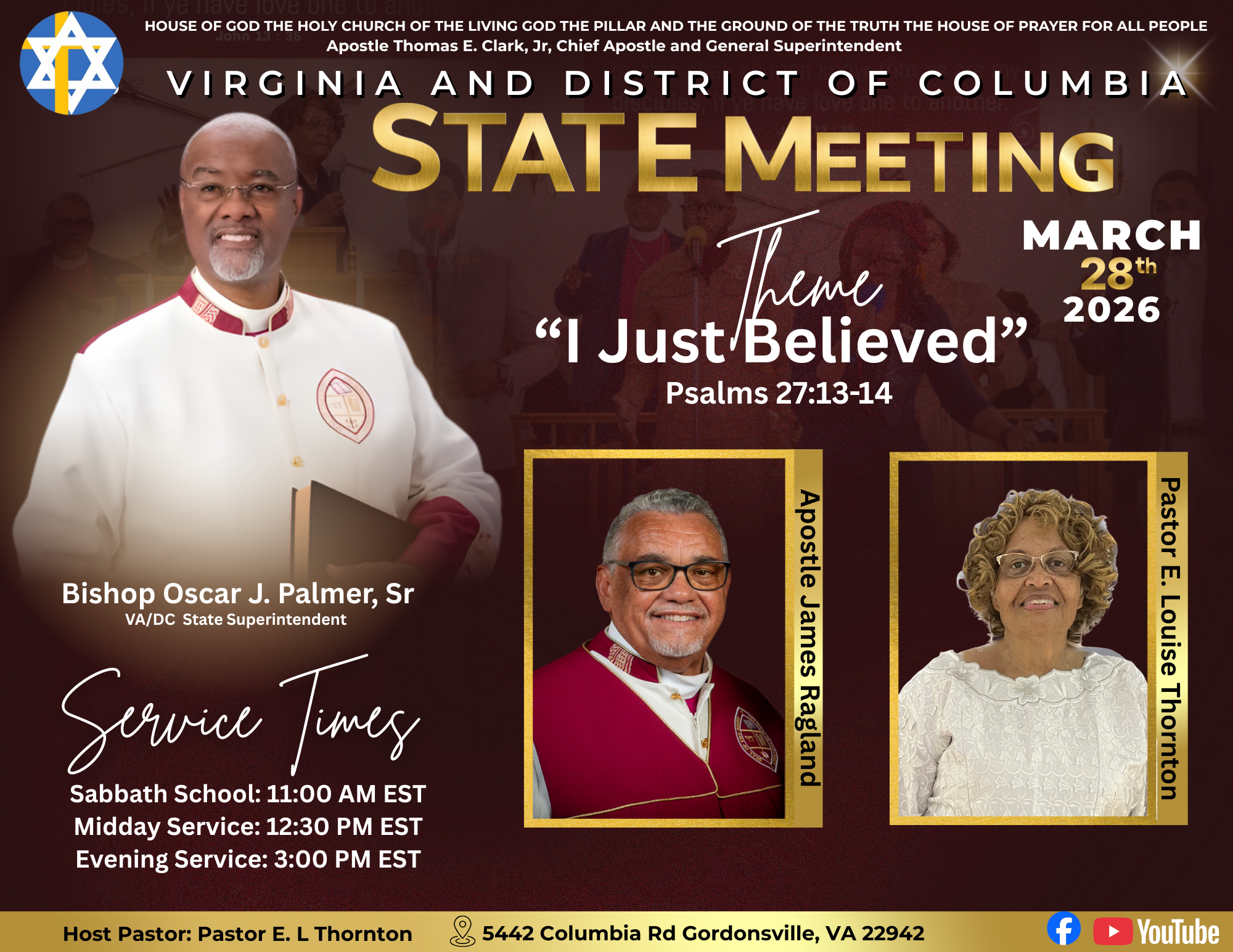 Join us for the House of God Virginia & District of Columbia State Meeting, a powerful gathering centered on the theme “I Just Believed,” inspired by Psalms 27:13–14. Taking place on March 28, 2026, this spirit-filled meeting will be led by Bishop Oscar J. Palmer, Sr., VA/DC State Superintendent, and hosted by Pastor E. Thornton at 5442 Columbia Rd, Gordonsville, VA. Come expecting encouragement, renewal, and a strengthened faith as we wait on the Lord together.